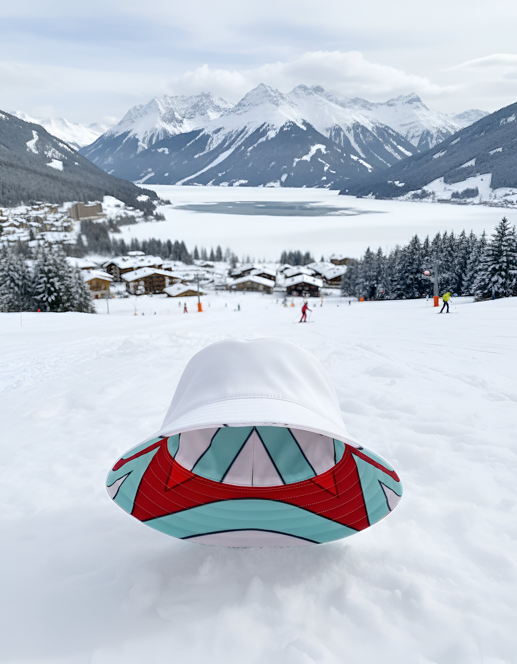 A rhythm for the rain — the Electric Boulevard Bucket Hat reimagines utility through the lens of 1980s glamour. Its gleaming waterproof finish catches light like a city after midnight, while the vivid bands of vermilion, teal, and crimson echo the glow of passing headlights and neon reflections in a wet boulevard.