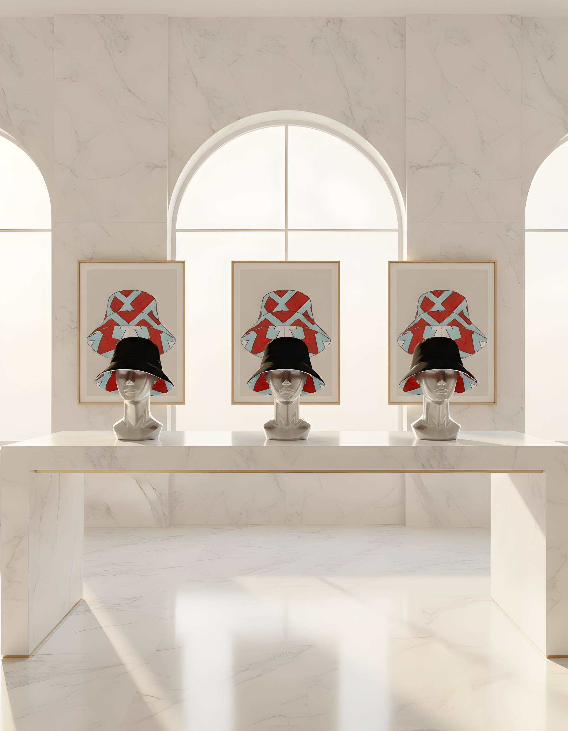 A rhythm for the rain — the Electric Boulevard Bucket Hat reimagines utility through the lens of 1980s glamour. Its gleaming waterproof finish catches light like a city after midnight, while the vivid bands of vermilion, teal, and crimson echo the glow of passing headlights and neon reflections in a wet boulevard.